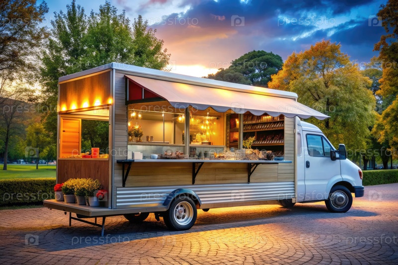 Грузовик с едой, готовый подать на закате в красивой обстановке парка