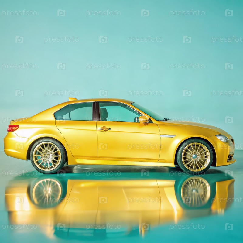 Элегантный золотой автомобиль, демонстрируемый на отражающей поверхности с синим фоном