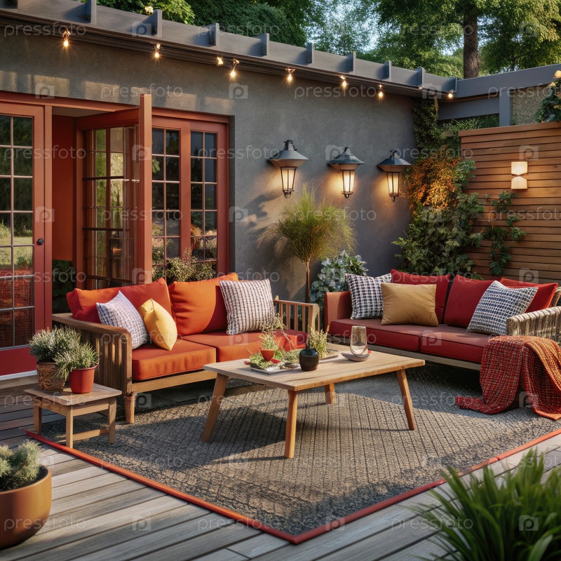 Уютный красный шикарный садовый дворик для летнего отдыха и собраний