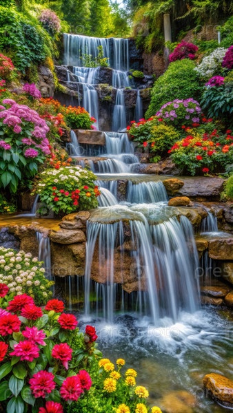 Спокойный небольшой водопад, окруженный яркими цветами в тихом саду