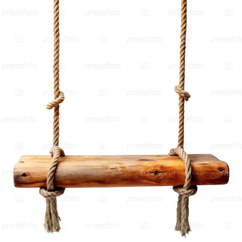 Древесное деревянное веревочное раскачивание висит на прочных веревках на белом фоне