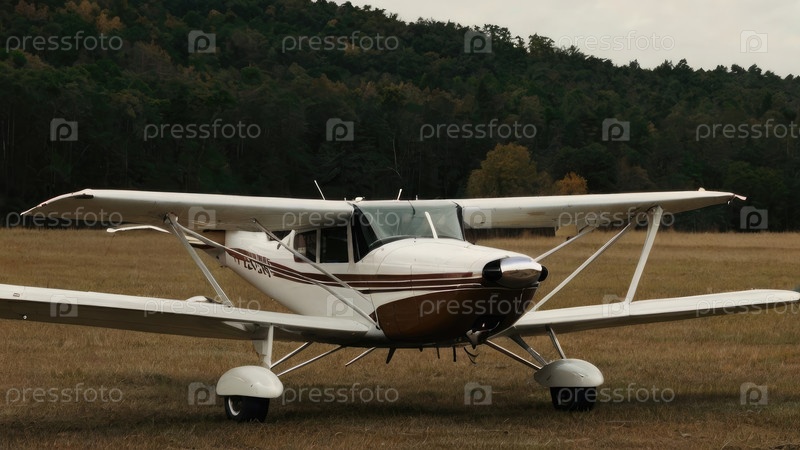 Самолет Cessna выполняет низкий проход над травяным полем, окруженным лесистыми холмами