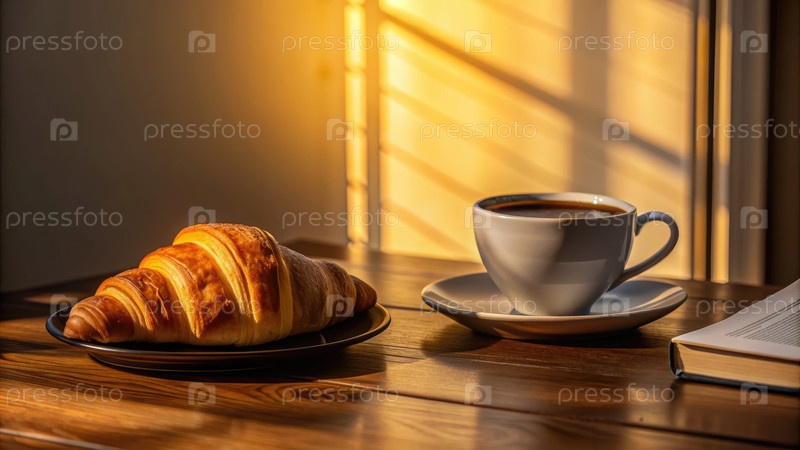 Свежесваренный кофе с кроасаном на деревянном столе во время заката