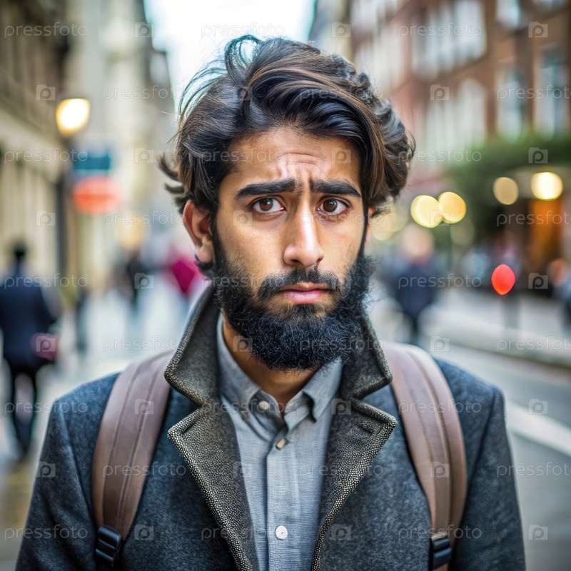 Молодой человек, идущий по оживленной улице Лондона в пальто и рюкзаке