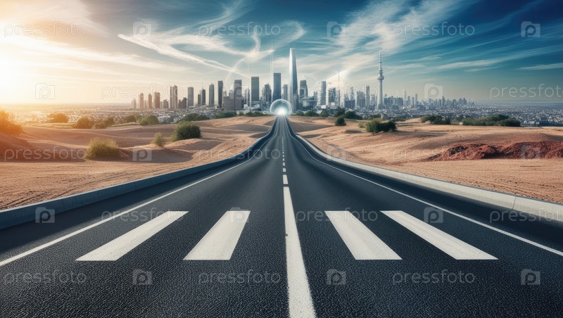 Футуристический городской горизонт с извилистой дорогой во время захода солнца