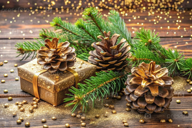 Очаровательные праздничные украшения с реалистичными сосновыми шишками и золотой коробкой для подарков