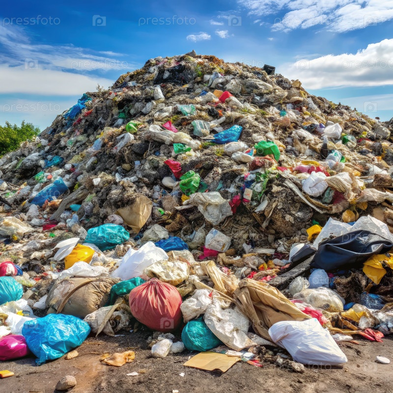 Гора смешанных отходов на свалке под чистым голубым небом днем