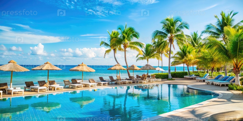Роскошный пляжный курорт с пальмами и привлекательным бассейном у океана на закате