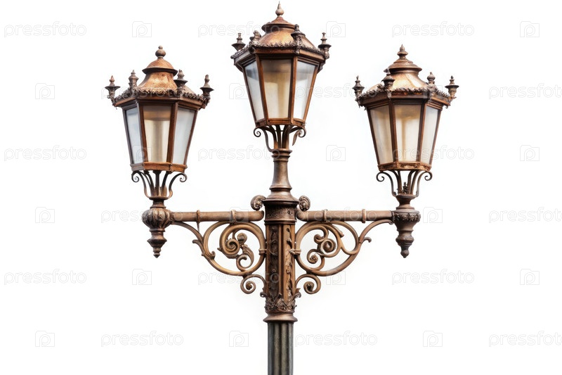 Винтажный уличный фонарик с тремя фонарями, изолированными на белом фоне