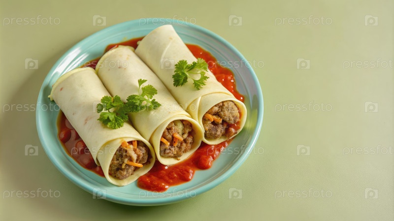 Тортильи с мясом и сыром, подаваемые на синей тарелке с соусом