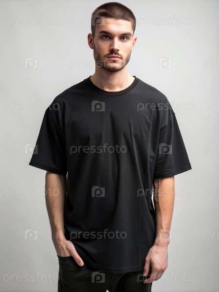 Мужчина в черной сверхразмерной футболке в минималистической комнате