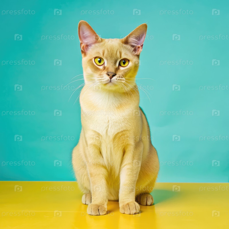Милая бирманская кошка, сидящая на желтой поверхности на голубом фоне