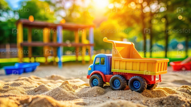 Вибрирующий игрушечный грузовик на песчаной детской площадке во время солнечного дня