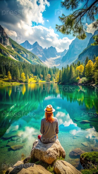 Человек, наслаждающийся спокойствием у кристально чистого озера в горном пейзаже