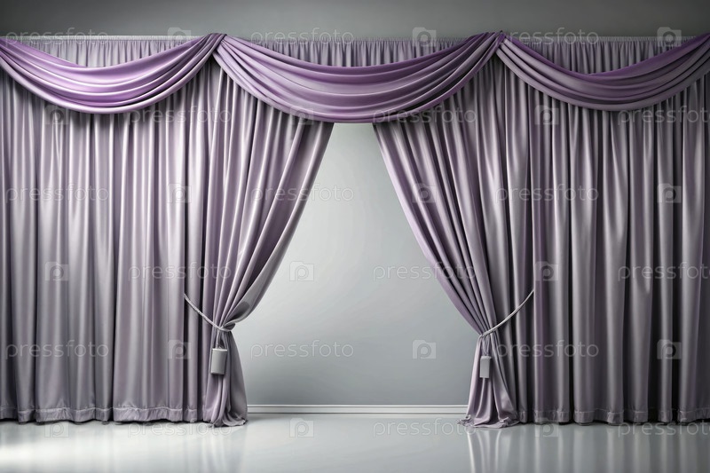 Фиолетовые драпированные шторы на белом фоне создают стильный эффект интерьера