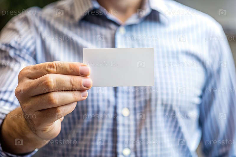 Рука, держащая пустую белую визитную карточку в профессиональной обстановке
