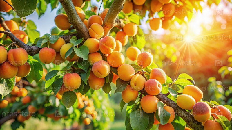 Зрелые абрикосы, висящие на дереве во время заката в пышном саду
