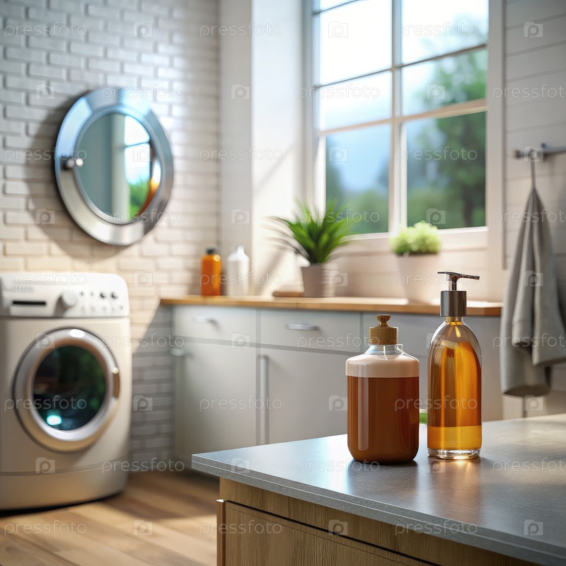 Яркая современная ванная комната с прачечной, демонстрирующая стильный декор и естественный свет