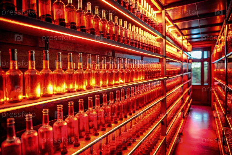 Комната, наполненная освещенными красным светом бутылками в дистиллярии