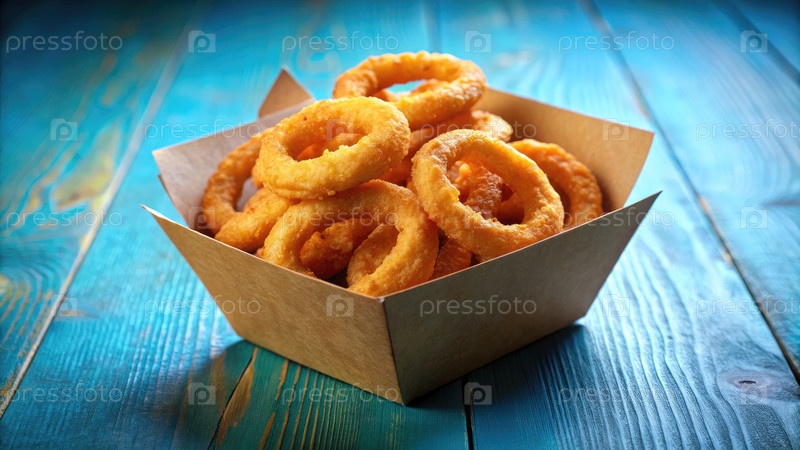 Золотые кольца из лука, сложенные в картонную тару на ярко-синем деревянном столе