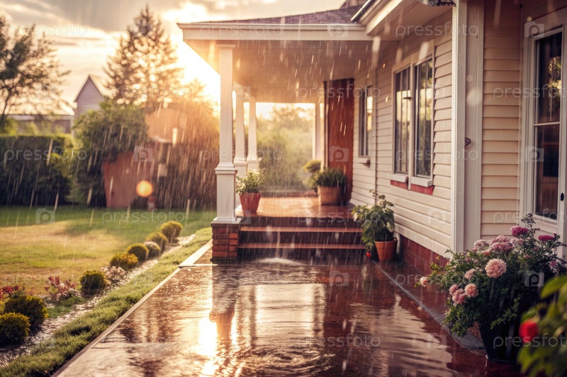 Солнечный летний дождь на крыльце с цветами и ярким садовым фоном
