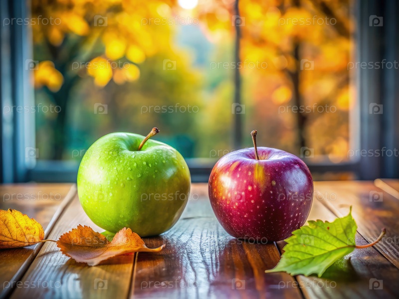 Красное и зеленое яблоки на отражающем столе во время осеннего дня