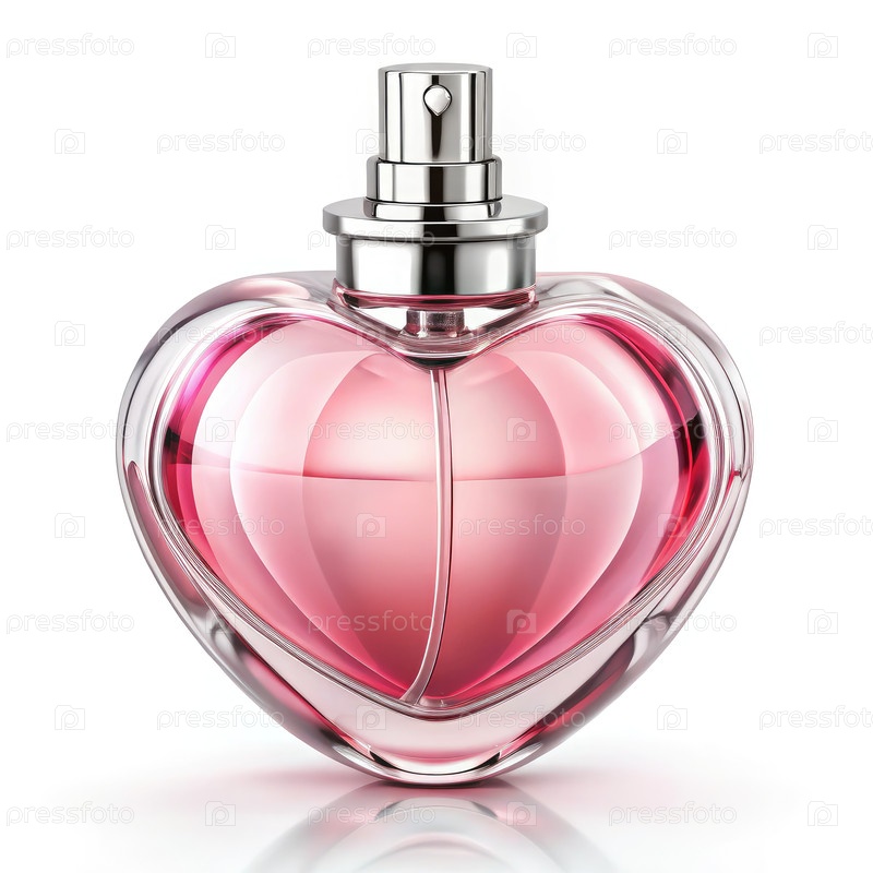Очаровательная бутылка парфюма в форме сердца, отображаемая на чистом белом фоне
