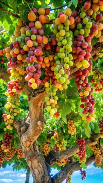 Живая виноградная лоза, вспыхивающая из красочных кластеров на солнечном винограднике