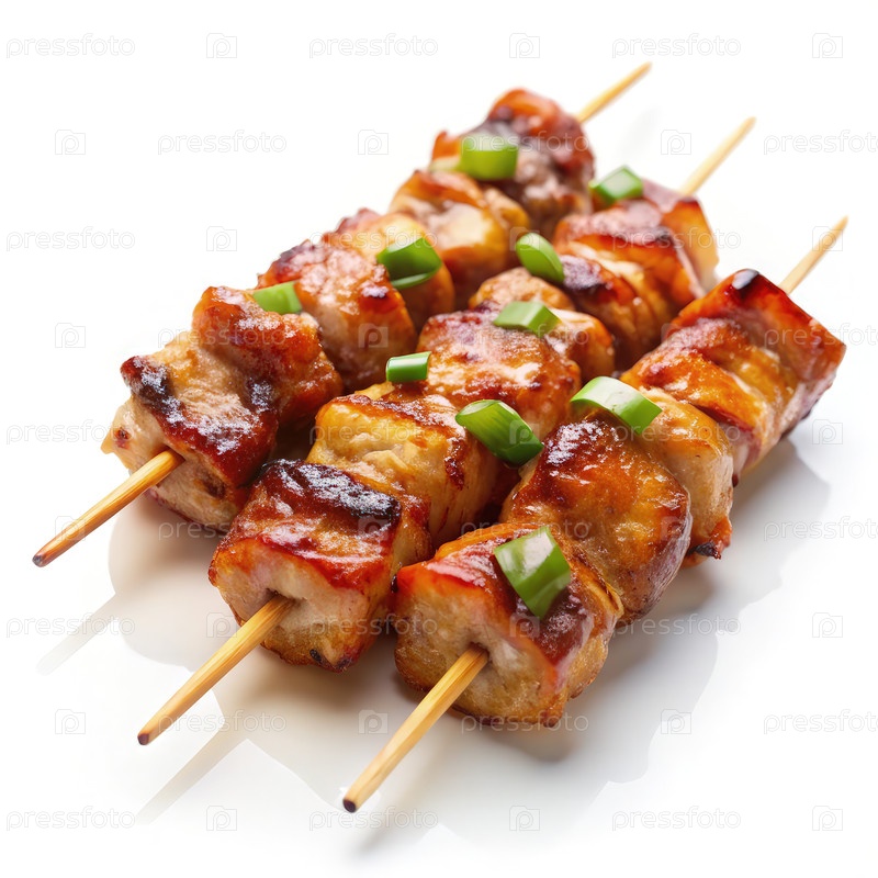Вкусные раковины якитори с жареным цыпленком и зелеными луками на белом фоне