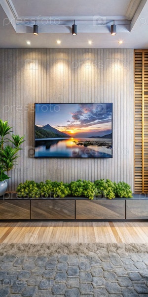 Современный интерьер гостиной с ландшафтом захода солнца и декоративными растениями