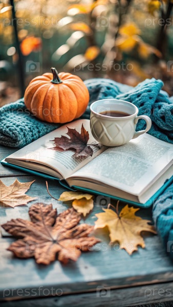 Уютный осенний день с чаем, тыквой и книгой среди красочных листьев
