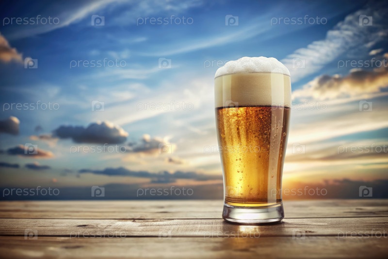 Наслаждайтесь освежающим бокалом пива с пеной на закате у моря