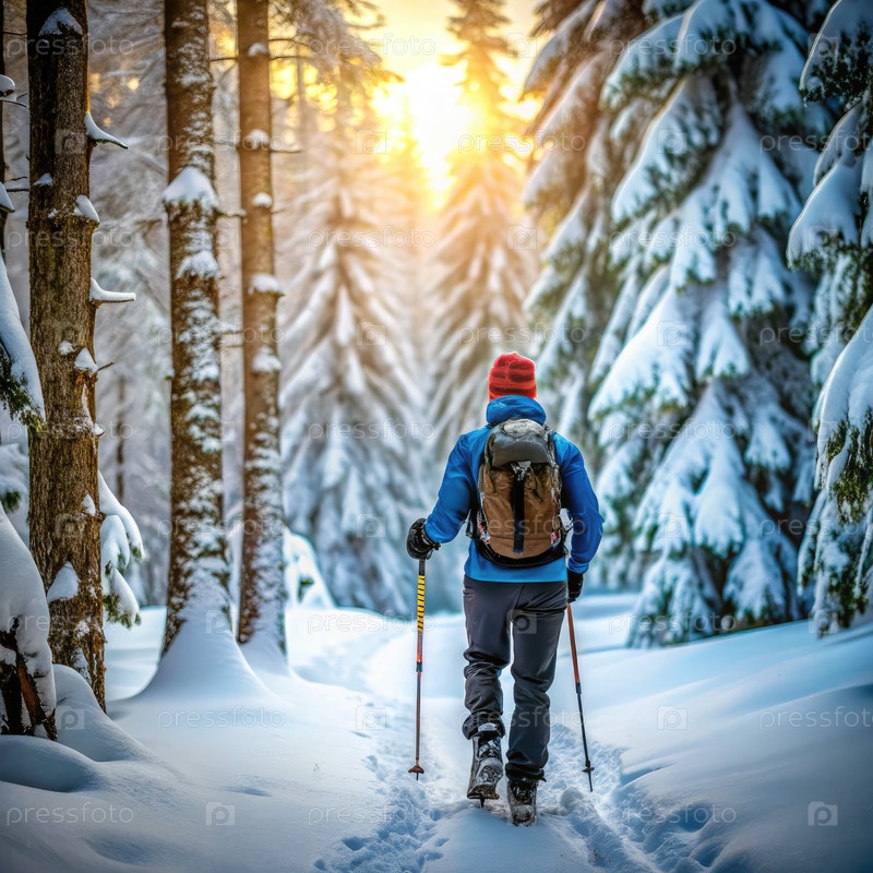Человек, катающийся на снегоходах по спокойному зимнему лесу при закате солнца