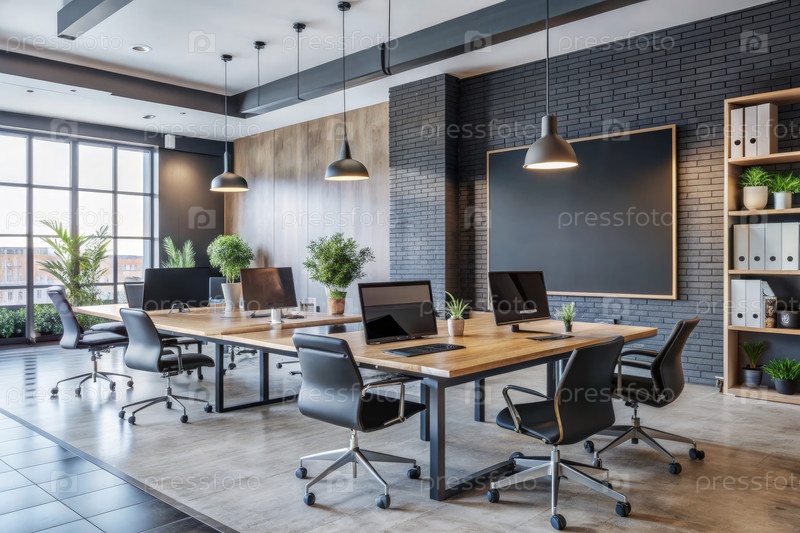 Офис современной дизайнерской компании с черными стенами и естественным светом