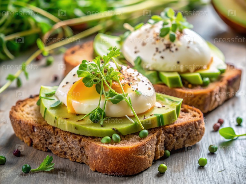Тост с авокадо, покрытый яйцами и микрозеленками на деревянном столе