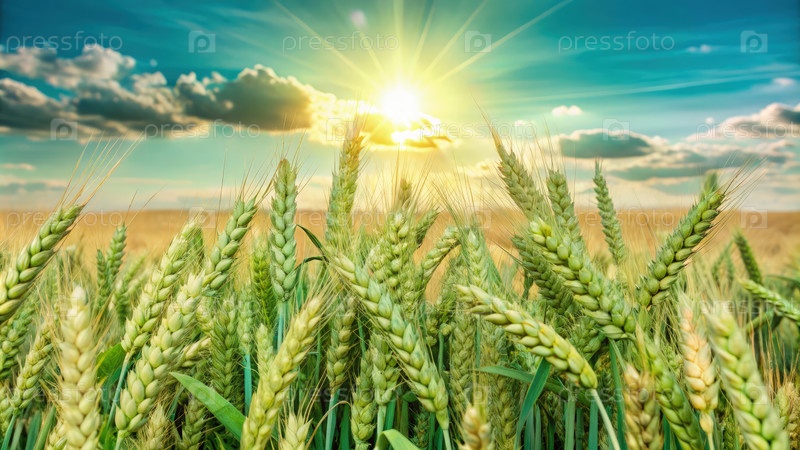 Пшеничное поле, освещенное восходом солнца под ярким голубым небом с облаками