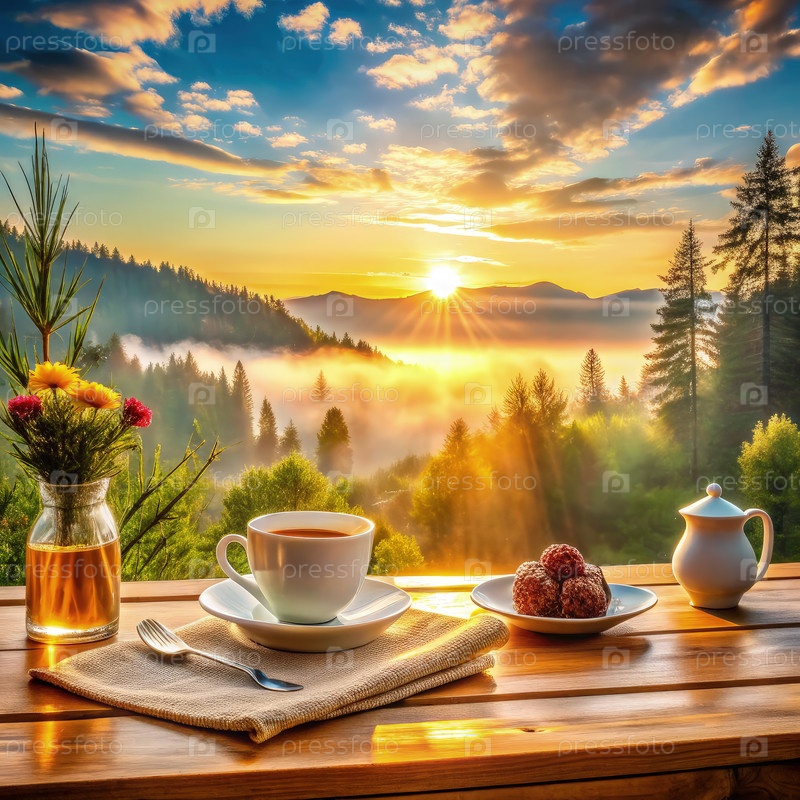 Наслаждаясь спокойным рассветным завтраком с кофе и закусками в лесу. генеративный ИИ