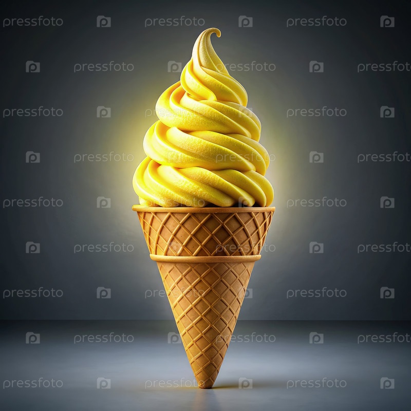 Кремный желтый мягкий подавать мороженое в конусе вафли на темном фоне
