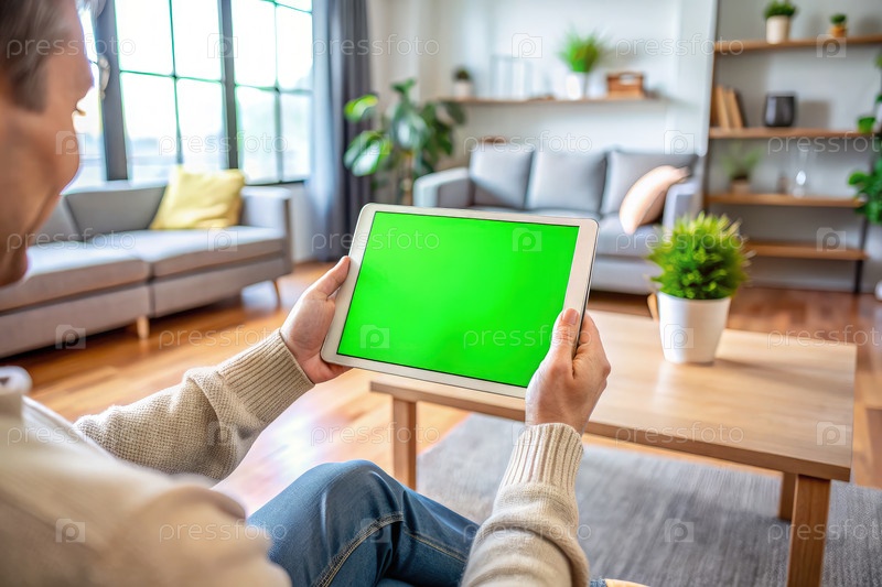 Человек, использующий планшет с пустым зеленым экраном в уютной гостиной