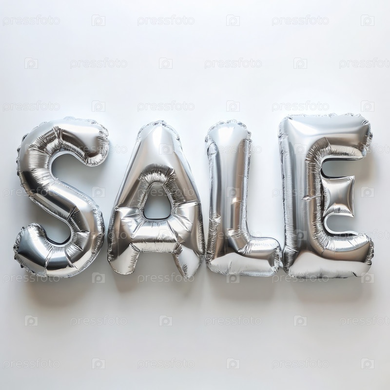 Серебряные шарики букв орфографической продажи на белом фоне для рекламных мероприятий