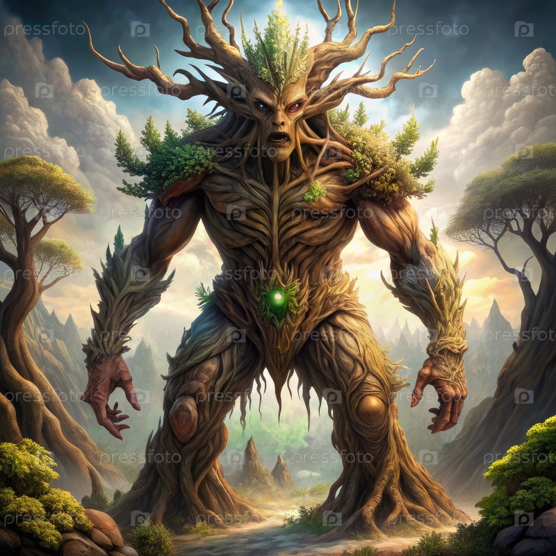 Высокий деревянный титан появляется в мистическом лесу под ярким небом