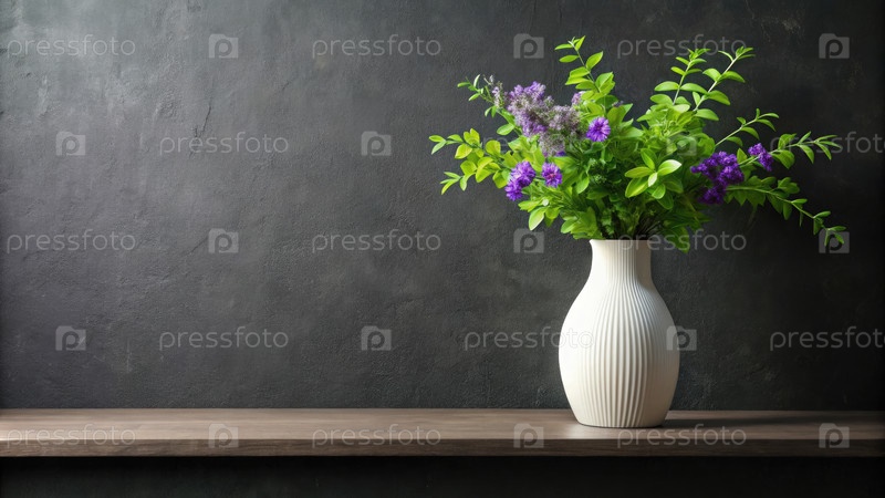 Белая керамическая ваза с зелеными листьями и фиолетовыми цветами на деревянной полке