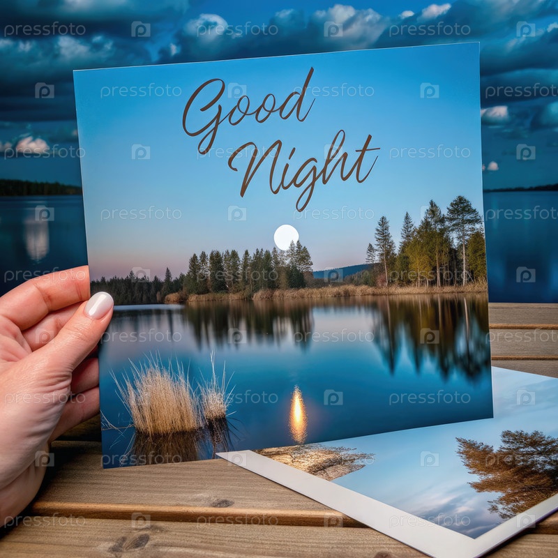Карта хорошей ночи с безмятежным видом на озеро при закате с отражающей водой