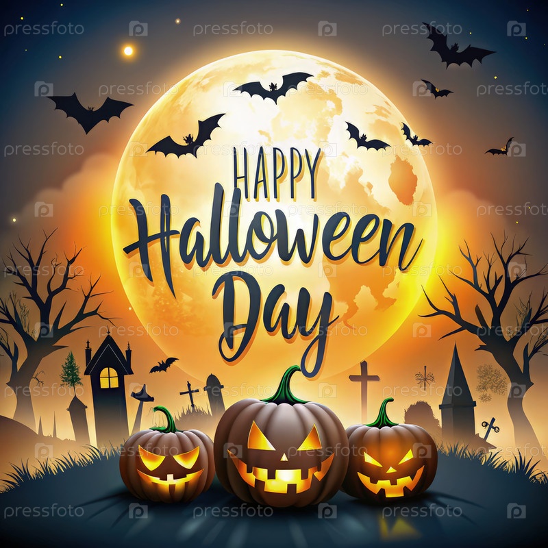 Ужасный фон Хэллоуина со светящимися тыквами и полнолунием