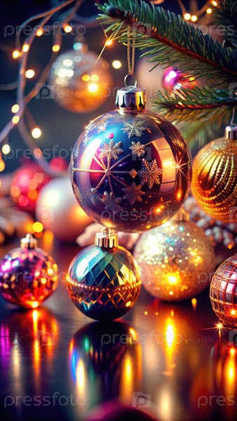 Красочная коллекция рождественских украшений, отражающая яркие праздничные огни