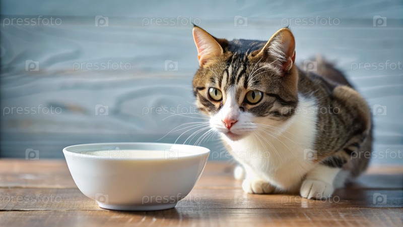 Кошка любопытно подходит к миске с молоком на деревянном столе в уютной помещенной обстановке