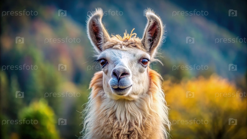 Стильная лама гордо стоит в красочном пейзаже в солнечный день