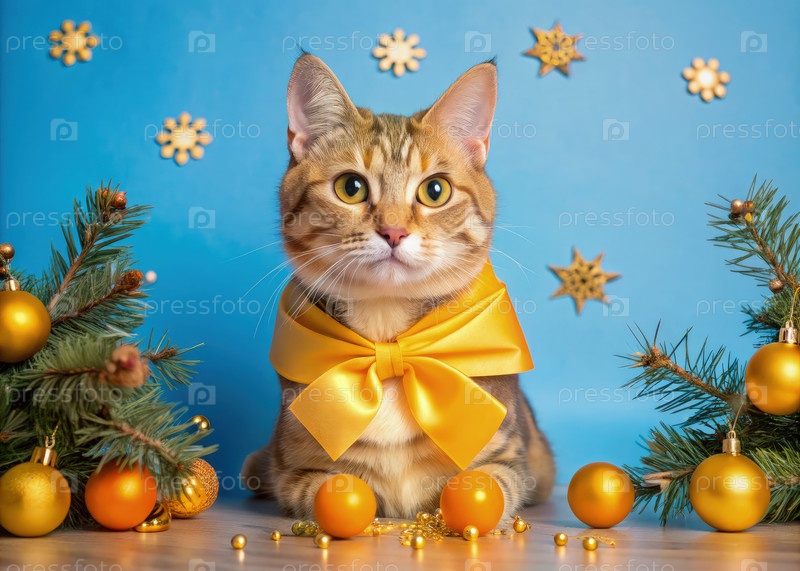 Праздничный кот в желтом луке, окруженный золотыми украшениями на Новый год