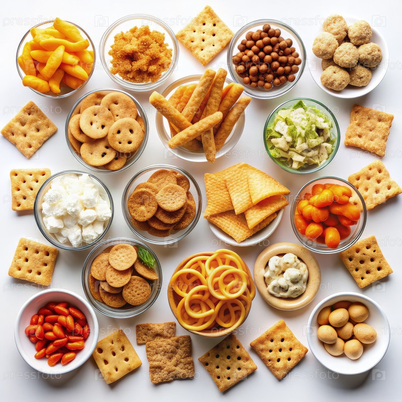Вид под высоким углом различных закусок, расположенных на белом фоне