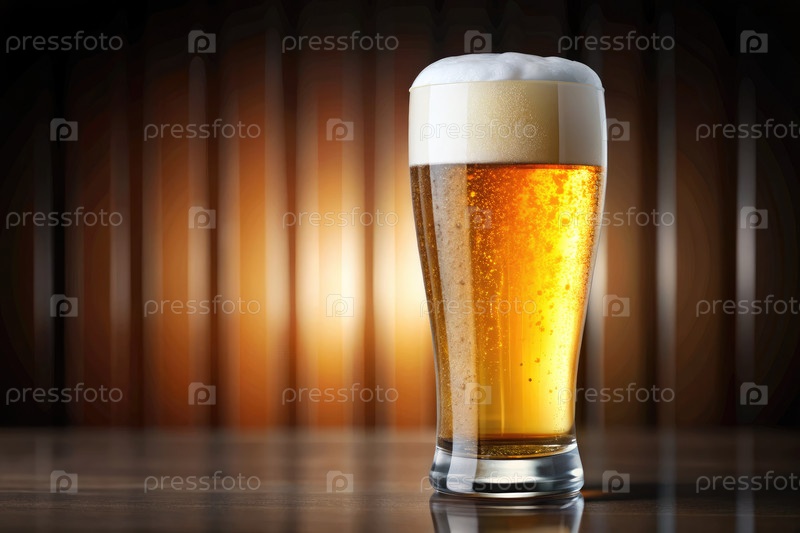 Векторная иллюстрация освежающего бокала пива с пеной на деревянном столе